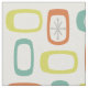 A simple minimalist 1950s abstract art pattern with rounded rectangles and sputnik starbursts in chartreuse, turquoise and orange.