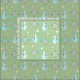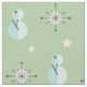 This retro mid century modern pattern with abstract snowmen, snowflakes and stars, in vintage colours of light blue and yellow against a faded green background.