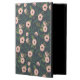 Chic floral patterned iPad case features a coral pink flowers and lush green leaves on a deep, smoky midnight blue background.