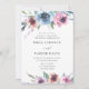 Elegant floral wedding invitations displaying your wedding details framed by a top and bottom border of purple, mauve & blue watercolor flowers with lush green leaves. The back features a solid dark blue background. Designed to coordinate with our Midnight Blooms wedding collection.