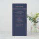 This modern and elegant wedding program features rose coloured text on a midnight blue background, with a faux rose gold stripe at the top.