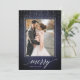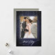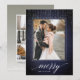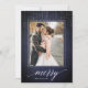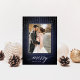 Elegant holiday photo card features a richly textured midnight blue background festooned with delicate white light garlands at the top. Add your favourite vertical or portrait oriented photo framed by a white border. "Merry" appears along the bottom in white calligraphy script lettering, with your family name tucked into the design. Personalize the back with three additional photos and a custom Christmas greeting.