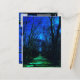 A blue and green abstract interpretation of a park trail photograph. Ominous wooded trees creep in from both sides, while shadows cross the centre path. These are great Halloween party invitations.