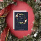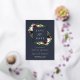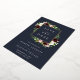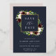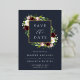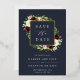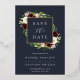 Our Midnight Romance wedding save the date frames the words "save the date" with an elegant border of burgundy marsala, blush pink and ivory flowers with lush green foliage with gold foil accents on a rich midnight blue background. Personalize with your names, wedding date, and location beneath, and add additional details to the back.
