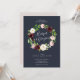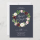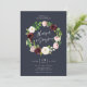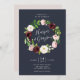Elegant floral wedding invitations feature a wreath of watercolor flowers in blush pink, ivory and burgundy marsala, interspersed with lush green botanical foliage and leaves, encircling your names in chic handwritten lettering on a rich midnight blue background. Personalize with your wedding details beneath.