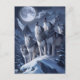 Three majestic wolves stand proudly on a mountain peak under the glowing full moon, silhouetted against the night sky.