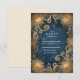 This striking celestial wedding design radiates luxury and mystique with a deep midnight blue background and intricate golden sun motifs. The swirling baroque details and glowing accents create a feeling of cosmic grandeur — perfect for celestial, gothic, or art nouveau-inspired weddings seeking a bold yet timeless look.
