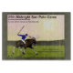 A polo player riding a moose (Alces alces), mallet raised to strike. The sun hangs low over the surrounding conifer forest. Text reading, "25 Midnight Sun Polo Game", "Sponsored by the North Star Polo Club", "Sunday at the Fairbanks Polo Grounds" and "Begins promptly at midnight Mosquitos and kinds under eight get in free" also appears.