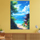 Step into a vibrant, sun-drenched scene that blends Japanese tradition with breathtaking natural beauty. This artwork, rendered in a crisp, anime-inspired style, features a majestic vermilion pagoda overlooking a perfect azure ocean. Lush greenery frames the view, inviting you down to the sparkling white beach where the clear, turquoise water meets the sand. It’s a perfect piece for anyone seeking to bring the tranquil yet vivid energy of a perfect Japanese summer day into their home or wardrobe.