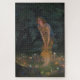 This design features a painting by the British artist Edward Robert Hughes (1851–1914). It shows a beautiful young woman in a mystical forest landscape. She is wearing an elegant golden dress and she has flowers under her arm and woven into her hair. The woman is slightly bending and she has her hands clasped together on her knees. The woman is standing barefoot on grass in the woodland. She is surrounded by a circle of small figures who may be fairies, and they are holding bright orbs of light. It is a magical scene of great beauty. In the background are oak trees. The original artwork was painted by Edward Robert Hughes circa 1908.