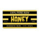 Étiquettes de pot de miel rayées noires et dorées avec une typographie de miel qui coule doré et un texte personnalisé pour le nom de l'entreprise d'apiculteur, les coordonnées et le poids net du produit.