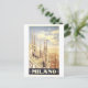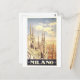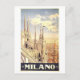 This postcard is a reproduction of a vintage travel poster featuring Milan (Milano), Italy.