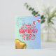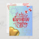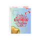 Front: The card has a light blue background. In the centre, there is a large red text that reads “Happy Birthday to You,” decorated with white and red stars. Above the text, there are two white fireworks, and scattered around are small stars. To the right, there are two gift boxes with red ribbons, and in the bottom left corner, there is a golden heart-shaped balloon.