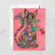 This beautiful cat sits against a gentle pink background, showing off her intricate, unusual markings, similar to those found on millefiori beads and glass. In her mouth she holds a single red rose, in this unique, uplifting, and highly detailed design.