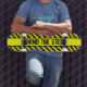 Skateboard in cool and funny warning sign design. "MIND THE STEP" Text is customizable.