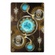 Turquoise lenses with antique watch with brass gears and golden keys on rusty, brown background. Steampunk style.