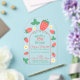 Sweet cute design that features a delightful and playful pattern of scattered mini strawberries on a soft, sky blue background. The strawberries are rendered in a vibrant red with green leaves, and they are interspersed with small, delicate white or light yellow strawberry flowers, adding to the charm. The overall impression is cheerful, fresh, and sweet.