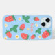 A sweet phone case that features a delightful and playful pattern of scattered mini strawberries on blue background. The strawberries are rendered in a vibrant red with green leaves, and they are interspersed with small, delicate white or light yellow strawberry flowers, adding to the charm. The overall impression is cheerful, fresh, and sweet, making it ideal for children or teenagers.