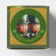 Miniature Leprechaun in 3D. Design on cube favour box + "Happy St Patrick's Day" into a green circle + vintage St Patrick's Day postcard as background.