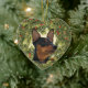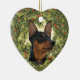 Portrait of a Miniature Pinscher against a green Christmas wreath sprinkled with red berries.
