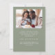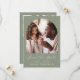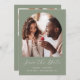 This simple, minimalist Save the Date card features a boho photo arch above the words "Save the Date" in elegant white handwriting script, followed by the couple's names, wedding date and city in sans serif font on a sage green background. Add a second, horizontal photo and a more detailed message with additional information on the reverse.