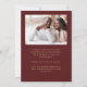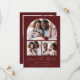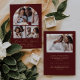 This simple, minimalist Save the Date card features a 3-photo collage arch above the words "Save the Date" in elegant gold-coloured handwriting script, followed by the couple's names, wedding date and city in sans serif font on a burgundy red background. Add a fourth, horizontal photo and a more detailed message on the back.
