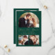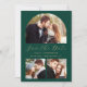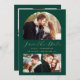 This simple, minimalist Save the Date card features a custom photo arch above the words "Save the Date" in elegant gold-coloured handwriting script, followed by the couple's names, wedding date and city in sans serif font on an emerald green background. Two smaller, square photos appear at the bottom of the card. Add a fourth, horizontal photo and a more detailed message with additional information on the back.