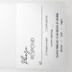 Modern black trifold wedding invitation featuring a simple and minimal design with the bride's name in an elegant script and the groom's name in a contemporary sans serif font. Below in the lower right corner are your event details in a minimalist layout. The middle panel has your favourite photo, the right panel is your RSVP card and the back has your additional details.