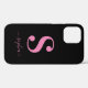 Minimal black case features a large pink monogram with your name in an elegant pink script font below it. Add your initial and name in the sidebar. Leave the box-shaped characters in the name field if you like the swashes (curving lines) at the beginning and end of the name. The first swash will only correctly line up with lower-case letters. Cases available for other models and devices in the sidebar.
