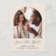This simple, minimalist boho Save the Date postcard features an arch-shaped photo above the words "Save the Date" in elegant white handwriting script, followed by the couple's names, wedding date and city in sans serif font on a beige background. Add your return address along with additional details on the back.