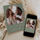 This simple, minimalist Save the Date card features a boho photo arch above the words "Save the Date" in elegant white handwriting script, followed by the couple's names, wedding date and city in sans serif font on a sage green background. Add a more detailed message with additional information on the reverse.