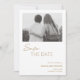 Modern faux gold wedding save the date card featuring a simple and minimal design with the header in an elegant script and a contemporary sans serif font. Above is your favourite photo and below in the lower right corner are your event details in a minimalist layout. The back has an optional QR Code and additional details. If you prefer, you may remove the QR Code in the design editing tool.