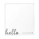 A minimal notepad design with a stylish handwritten script large typograhy quote "hello" paired with your own name and a simple black heart. Designed in a modern mininalist style in clean simple black and white. The perfect personalized gift or accessory for any time of year!