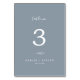 This minimal leaf blue and white wedding table number is perfect for an elegant wedding. The design features a simple greenery silhouette in white on a dusty blue background with classic minimalist style. The card prints on the front and back (double-sided). Items are printed exactly as they appear on your screen when you add to cart, so personalize and add each table number that you need to your cart individually.