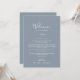These minimal leaf blue and white welcome letter & itinerary cards are perfect for an elegant wedding. The design features a simple greenery silhouette in white on a dusty blue background with classic minimalist style. The front of the card features a welcome letter and the back of the card features the wedding itinerary. These notes are perfect for destination weddings and hotel guest welcome bags.