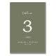 This minimal leaf dark green wedding table number is perfect for a boho wedding. The design features a simple greenery leaf silhouette in olive green with minimalist mountain bohemian style. The card prints on the front and back (double-sided). Items are printed exactly as they appear on your screen when you add to cart, so personalize and add each table number that you need to your cart individually.