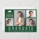 Minimal modern gren graduation announcement and party invitation featuring a 4 picture photo collage, "Graduate" written across the bottom in large white letters and the grad's class year, name and school or university in simple white typography. Add the party details on the reverse side.