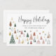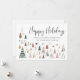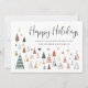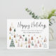 Fun minimal modern Christmas card featuring retro abstract illustrations of green, terracotta and gold trees and stars, "Happy Holidays" in a stylish script and your greeting and name in simple typography.