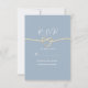 Simple, minimalist, modern, white and dusty blue wedding RSVP card with gold rope heart and trendy handwritten script.