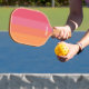 Vertical striped pink and orange toned pickle ball paddle with your name printed in a script font.