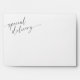 Complete your wedding suite with this A7 return address envelope featuring a minimal script design. The front includes the phrase “special delivery” in elegant calligraphy, while the back displays your personalized return address. Sized to fit 5x7 wedding invitations, it adds a thoughtful and functional touch to your wedding mail. Ideal for save the dates, invites and thank you cards.