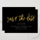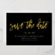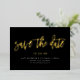 This modern yet elegant save the date announcement features a chic black background, the greeting "save the date" and your wedding date in gold foil, with your info beneath in white. You can customize this design even further by adding another photo or additional text to the back. Foil is available in gold, silver, or rose gold and absolutely shines!
