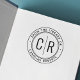 From the library of or this book belongs to rubber stamp with your monogram initials in the center separated by a vertical line, and custom text and name in a modern sans-serif font. An elegant and minimal bookplate design.