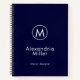 Modern notebook features a minimal design in classic navy blue and white. Custom name and title presented in stylish simple font with a complimentary minimal monogram medallion.