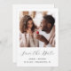 This simple, minimalist Save the Date card features a square photo above the words "Save the Date" in elegant black handwriting script, followed by the couple's names, wedding date and city in sans serif font on a white background. Add a more detailed message with additional information on the reverse, along with a QR code that sends guests to your wedding website.