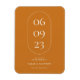 This unique and minimalist wedding save the date magnet card features modern typography in white on a golden orange ochre background with an oval frame for your wedding date. Personalize it with your own wedding information.