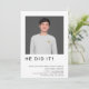 Minimal modern style to invite guests to your son’s graduation party, with his photo and details in simple typography. Easily personalise the text and replace the photo in the template with your own. Shown here with black text and a coordinating black background on the back, however it's fully customisable and you can select any colours for text and background to better match your own photo via the cjustomise further option. A photo cropped to square before uploading will work best so your subject fits correctly in the placeholder. If you need any assistance please let me know.