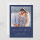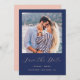 This simple, minimalist Save the Date card features a square photo above the words "Save the Date" in elegant blush pink handwriting script, followed by the couple's names, wedding date and city in sans serif font on a navy blue background. Add a more detailed message with additional information on the reverse in navy blue on a blush pink background, along with a QR code to help guests access your wedding website.