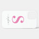 Minimal white case features a large pink monogram with your name in an elegant dark grey script font below it. Add your initial and name in the sidebar. Leave the box-shaped characters in the name field if you like the swashes (curving lines) at the beginning and end of the name. The first swash will only correctly line up with lower-case letters. Cases available for other models and devices in the sidebar.