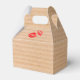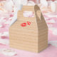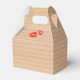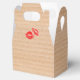 A minimalist favor box featuring a bold red lipstick kiss on a natural cardboard background.